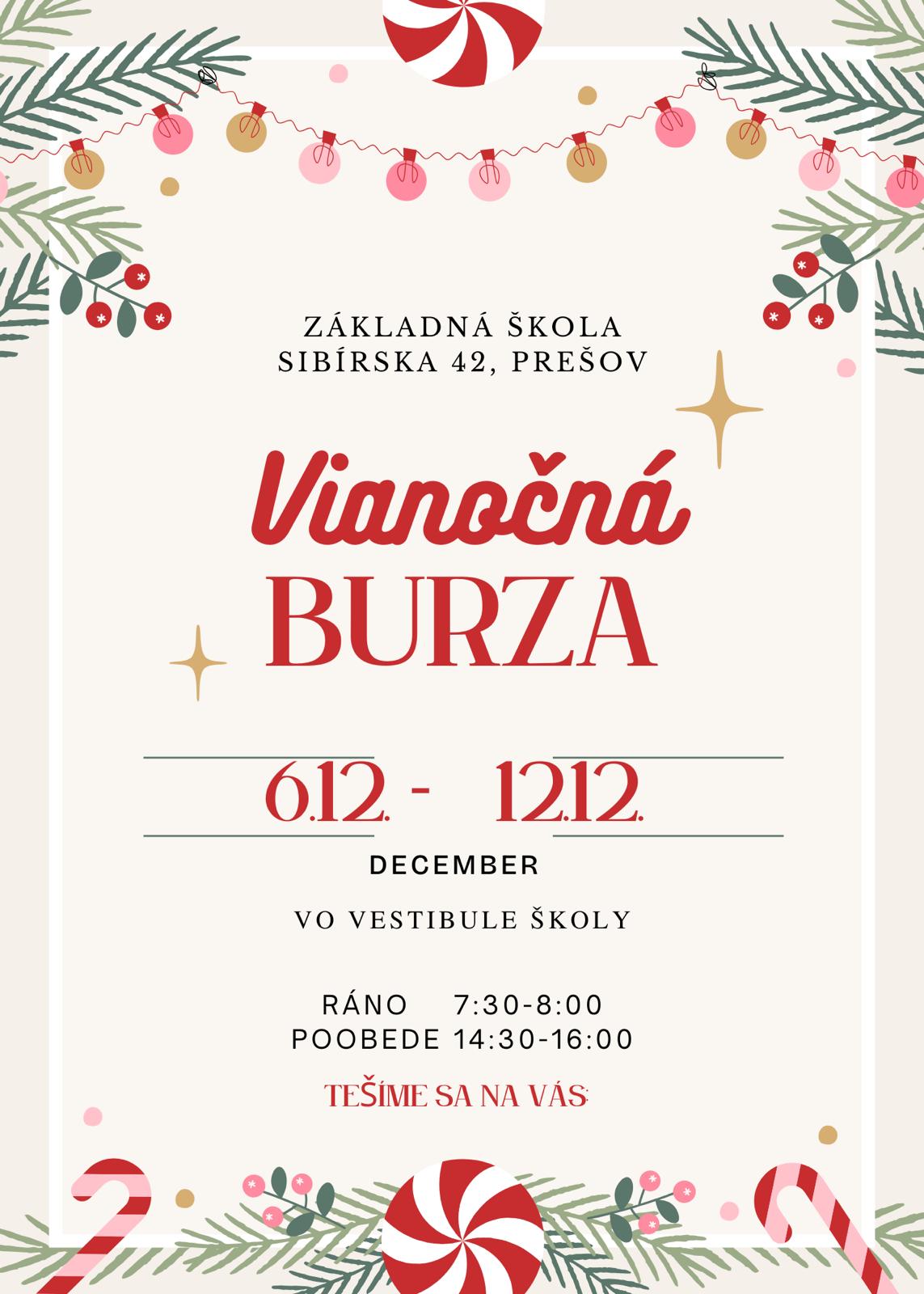 Srdečne Vás pozývame na Vianočnú burzu, ktorá sa bude konať: 6.12-12.12.2024 Čas: 7:30-8:00 , 14:30-16:00 Miesto: vo vestibule školy
