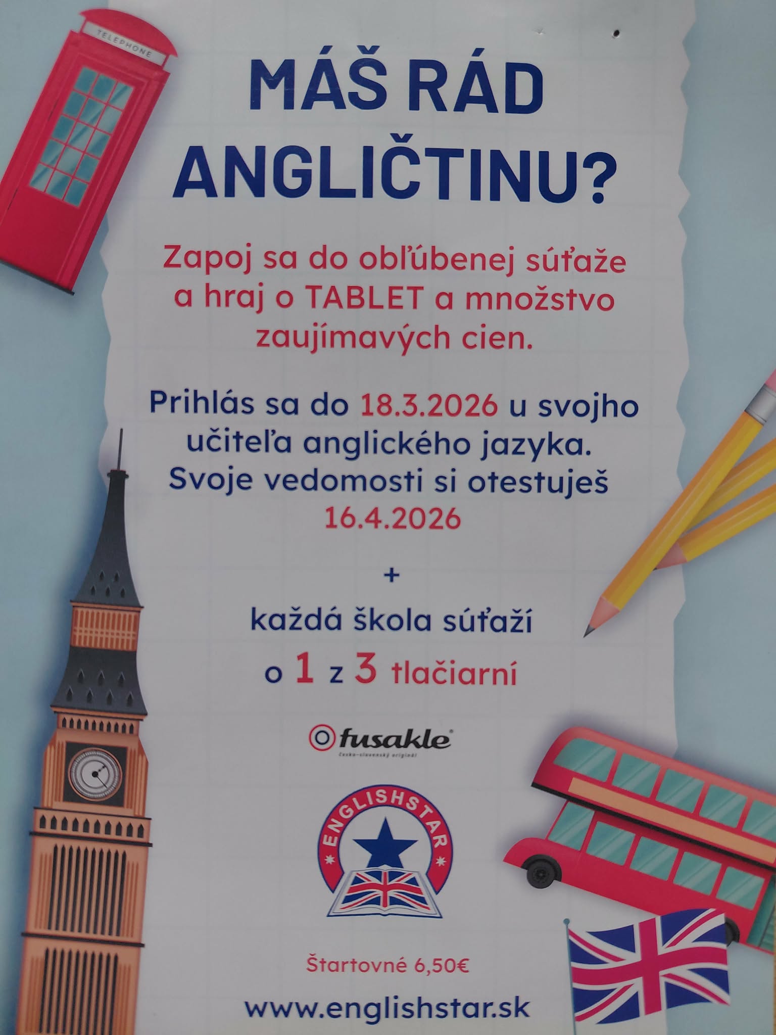 Aj tento rok Vás srdečne pozývame zapojiť sa do veľmi peknej a obľúbenej súťaže v anglickom jazyku - ENGLISHSTAR. Otestujete si svoje vedomosti, zabavíte sa a možno aj vyhráte smartfón. Súťaž je určená pre všetkých žiakov - každý žiak súťaží v svojej ročníkovej kategórií.