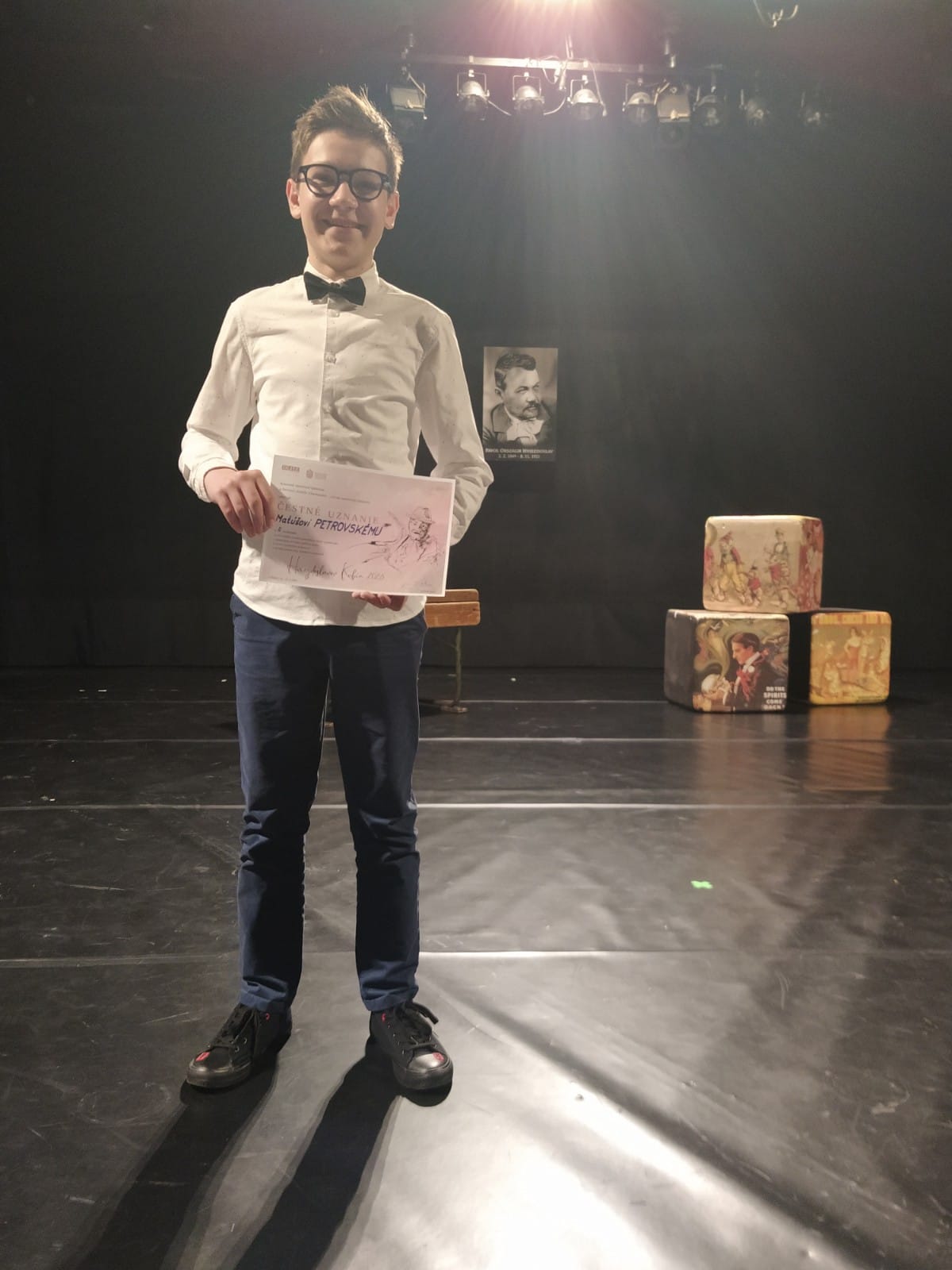 Dňa 25.- 26. 04. 2023 sa v Divadle Jonáša Záborského konala KRAJSKÁ prehliadka spojená so súťažou v prednese poézie a prózy - HVIEZDOSLAVOV KUBÍN. Náš žiak, Matúš Petrovský zo 6.A, ktorý postúpil v okresnom kole ako naše " horúce želiezko," nás nesklamal. Vyrovnane bojoval aj so žiakmi literárno - dramatických útvarov ZUŠ a okrem pochvaly od poroty si priniesol aj Čestné uznanie za prednes v II. kategórii prózy.